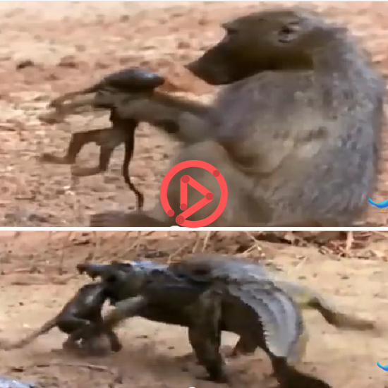 어느 순간, 악어 한 마리가 쏜살같이 새끼 바분을 낚아채 도망갑니다.