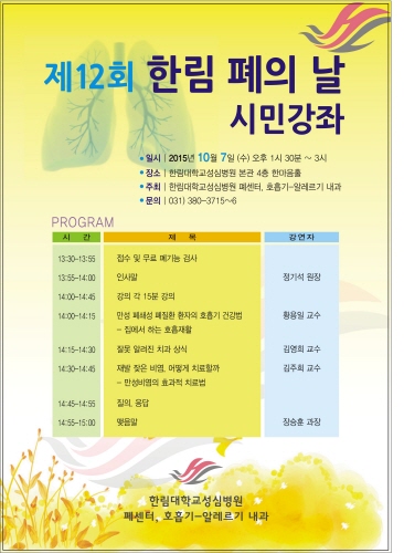 [쿠키뉴스=김단비 기자] 한림대학교성심병원 폐센터가 다음달 7일(수) 오후 1시 30분부터 오후 3시까지 본관 4층 한마음홀에서 제12회 한림 폐의 날 시민강좌를 개최한다.