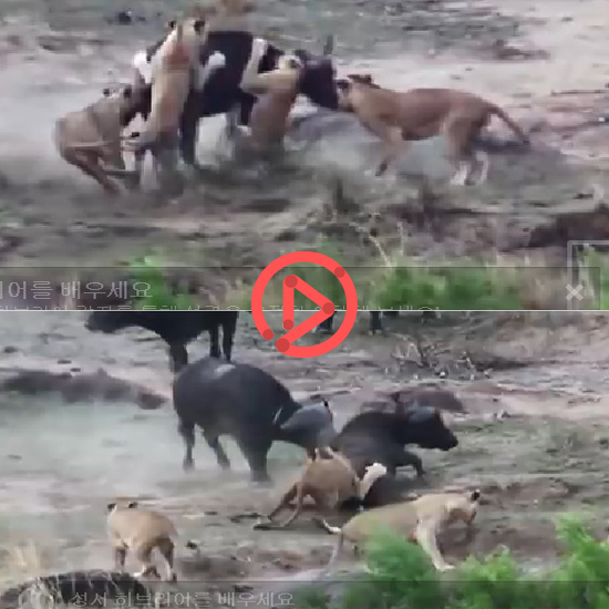여러 마리의 사자들이 버팔로를 둘러싸고 사냥에 한창입니다.