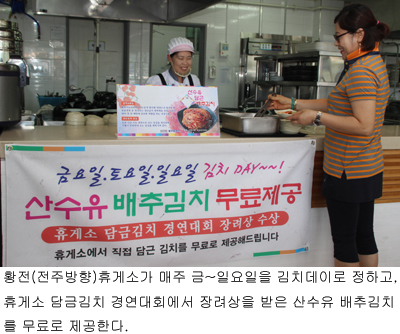 7일 한국도로공사 순천완주고속도로 황전(전주방향)휴게소는 매주 금~일요일을 김치데이(day)로 정하고 산수유 배추김치를 무료로 제공한다고 밝혔다.