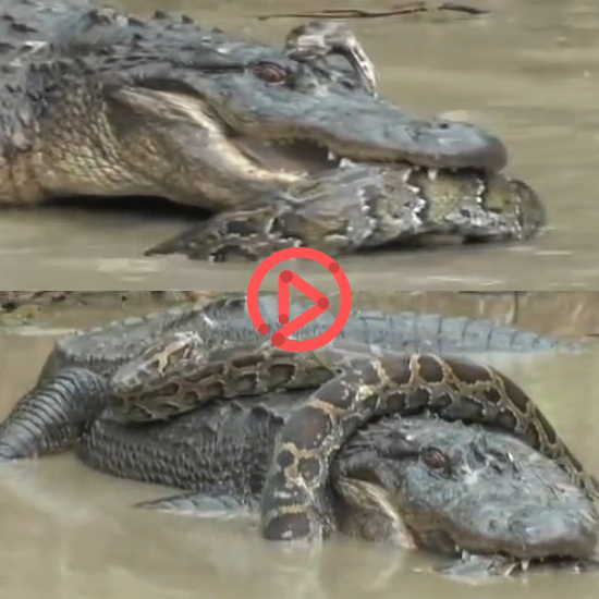 강력한 턱과 이빨로 구렁이의 몸통을 공격하는 악어.