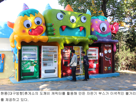 현풍(대구방향)휴게소는 커피와 음료를 판매하는 도깨비 테마공원의 자판기 부스를 재미있는 도깨비 모양으로 꾸몄다. 형형색색의 익살스러운 도깨비 캐릭터를 활용한 자판기 부스는 어린이는 물론 어른들의 동심을 자극하고 있다.