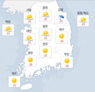내일 오후들어 서울은 25도, 춘천 25도, 강릉 25도, 대전 25도, 청주 25도, 대구 26도, 광주 26도, 전주 25도, 부산 26도, 제주 23도 등으로 오르겠다.