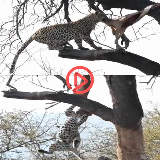 먹다 남긴 반토막 난 먹잇감을 물고 나무 아래로 내려가려는 표범의 영상입니다.