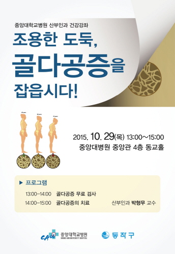 [쿠키뉴스=김단비 기자] 중앙대학교병원이 오는 29일(목) 오후 2시부터 병원 중앙관 4층 동교홀에서 ‘조용한 도둑, 골다공증을 잡읍시다!'란 주제로 건강강좌를 개최한다.