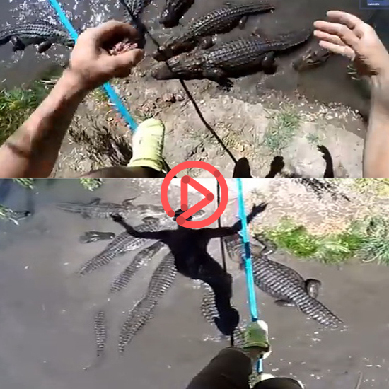 이 남성은 좀 더 자극적인 상황을 만들고자 먹잇감을 조금씩 떼어 던져주면서 악어들을 유도하는데요.