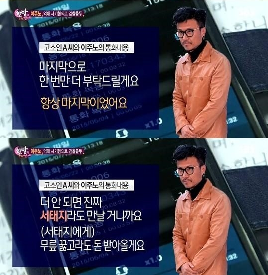 이주노와 A씨와 통화 내용도 전해졌다. 이 통화에서 이주노는 “한 번만 더 부탁드린다. 정 안 되면 서태지라도 만나겠다. 무릎 꿇고라도 돈 받아오겠다. 내가 오죽하면 서태지까지 만난다고 말을 하겠냐”며 시간을 달라고 호소했다.