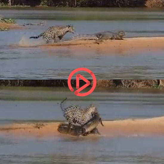 이 악어를 덮치기 위해 강까지 건너는 것을 주저 않는 재규어는 조용히 헤엄쳐 악어가 있는 얕은 섬까지 다다릅니다.