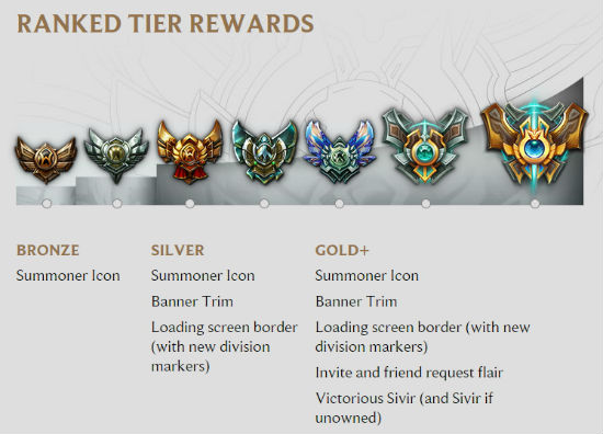 로딩화면 테두리의 경우 각 티어별로 구분 지급되며, 첼린저 티어는 순위별로 소환사 아이콘이 지급된다.
