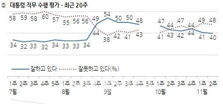 한국갤럽은 지난 10일부터 12일까지 실시한 11월 2주차 여론조사 결과 박 대통령 지지율이 40%를 기록했다고 13일 밝혔다. 조사대상은 유권자 1012명으로, 응답률 20%, 95% 신뢰수준에 표본오차 ±3.1%포인트다.