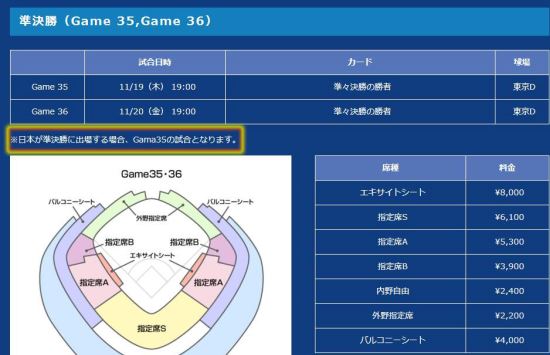 ‘日本が準決勝に出場する場合、Game35の試合となります(일본이 준결승에 진출하는 경우, Game35 시합이 됩니다.)’