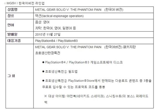 상기 라인업에 있어서, MGSV:TPP는 본편 메인 미션은 물론, 싱글 온라인 대전모드 ‘Forward Operating Base(FOB)’나, 멀티 온라인 대전모드 ‘METAL GEAR ONLINE(MGO)’에 대해서도 한국어 자막에 대응한다.