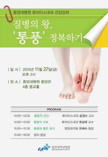 이번 강좌를 준비한 류마티스내과 송정수 교수는 “통풍을 앓고 있는 환우분들은 물론 통풍에 관심있는 분이면 누구나 강좌에 참석하여 올바른 치료방법들을 숙지해 건강에 도움이 되는 시간이 되길 바란다”고 전했다.