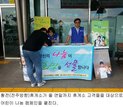 황전휴게소는 사단법인 ‘함께하는 사랑밭’과 공동으로 올해 연말까지 휴게소 매장 입구에서 ‘어린이를 위한 나눔 캠페인’을 펼친다고 밝혔다.