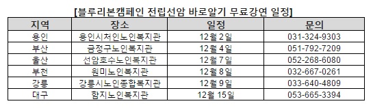용인, 부산, 울산, 부천, 강릉, 대구 등 6개 지역 노인복지관에서 열리는 ‘전립선암 바로알기’ 건강강좌는 누구나 무료로 참석할 수 있다.