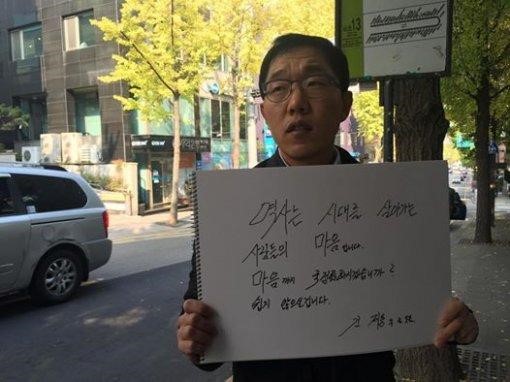 이들이 시위를 벌인 것은 SBS ‘힐링캠프’에 출연 중인 김제동이 역사교과서 국정화 반대 입장을 공개적으로 드러냈기 때문이다. 이달 3일 주간지 ‘시사인’ 주진우 기자는 자신의 페이스북에 “역사는 시대를 살아가는 사람들의 마음입니다. 마음까지 국정화하시겠습니까? 쉽지 않으실 겁니다”라고 쓰인 피켓을 들고 있는 김제동 사진을 올렸다.