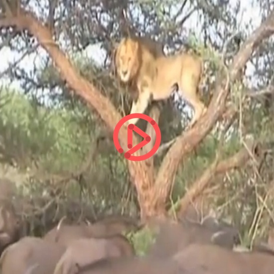 겁먹은 수사자는 나무 위에서 이리저리 피할 궁리를 해보다 아차! 중심을 잃고는 나무에서 떨어질 위기까지 겪습니다.