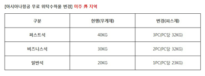 아시아나항공은 그간 국제선 위탁수하물 운송에 있어 ‘피스제(Piece Sytem, 미주 노선)’와 ‘무게제(Weight System, 미주 외 지역)’를 혼용하여 운용해 왔으나, 이번 규정 변경을 통해 향후 피스제로 일원화해 운용하게 된다.