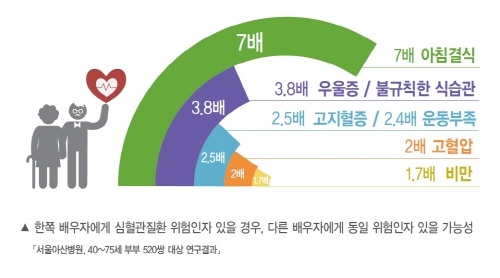 대표적인 심혈관질환 위험인자인 고지혈증과 고혈압이 한쪽 배우자에게 있으면, 다른 배우자에게 같은 위험인자가 있을 위험도가 둘 다 위험인자가 없을 때에 비해 각각 2.5배, 2배로 증가했다.