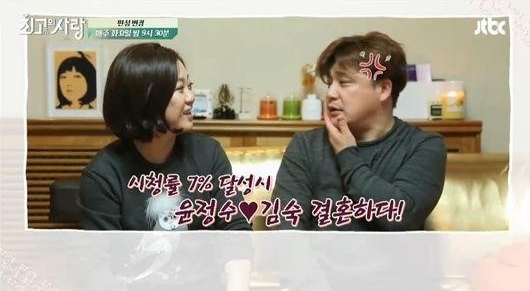 3일 방송된 JTBC 예능 ‘님과 함께 시즌2 -최고(高)의 사랑’에선 윤정수와 김숙이 시청률 공약을 하는 모습이 그려졌다.