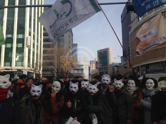 이날 일부 시민들은 박 대통령이 최근 국무회의에서 복면 시위 참가자들을 테러단체 ‘이슬람국가(IS)’에 비유한 것을 겨냥해 가면으로 얼굴을 가리고 나와 “우리가 IS냐”고 외치기도 했다.