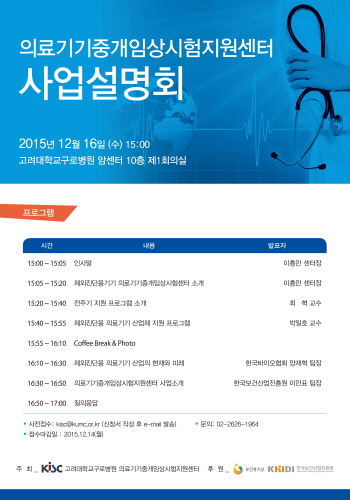 사업설명회는 △체외진단용기기 의료기기 중개임상시험지원센터 소개(이흥만 이비인후과 교수) △전주기 지원프로그램 소개(최혁 의생명연구지원센터 교수) △체외진단용 의료기기 산업체 지원 프로그램(박일호 이비인후과 교수) △체외진단용 의료기기 산업의 현재와 미래(양재혁 한국바이오협회 팀장) △ 의료기기 중개임상시험지원센터 사업소개(이만표 한국보건산업진흥원 팀장) 순으로 진행된다.