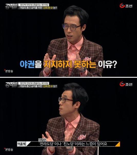 이윤석은 9일 종합편성채널 TV조선 ‘강적들’에 출연, 새정치연합의 내부 갈등에 대해 이야기하다 “야당은 전라도당이나 친노당이라는 느낌이 있다”며 “저처럼 정치에 별로 관심이 없었던 사람들은 기존 정치인이 싫다”고 말했습니다.
