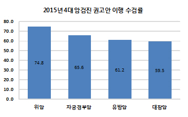 암종별 권고안 이행 수검률은 위암이 74.8%, 자궁경부암 65.6%, 유방암 61.2%, 대장암은 59.5%였다.