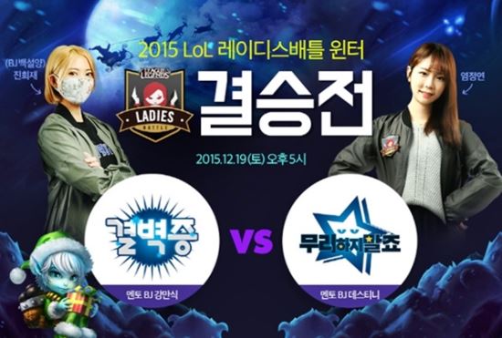 [쿠키뉴스=이다니엘 기자] 라이엇게임즈가 주최하고 한국e스포츠협회가 주관하며, 아프리카TV에서 방송하는 국내 리그 오브 레전드(LoL) 공식 여성 아마추어 대회인 '2015 LoL 레이디스 배틀 윈터'의 결승전이 오는 19일 개최된다. 여성 LoL 최강팀을 가리는 마지막 결전에서 맞붙게 된 팀은 ‘무리하지말죠’와 ‘결벽증’이다.