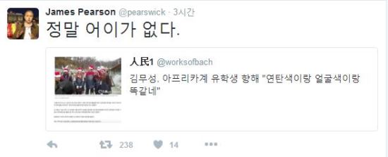 영국 로이터 통신의 제임스 피어슨 서울 주재 기자는 18일 트위터에 해당 소식을 전하는 기사를 올리면서 한글로 “정말 어이가 없다”고 적었다.
