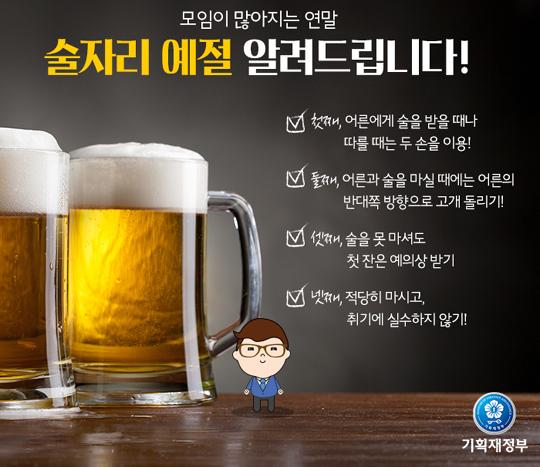 기획재정부 트위터는 21일 “모임이 많아지는 연말, 술자리 예절 알려드립니다!”라는 글을 올렸습니다. △어른에게 술을 받을 때나 따를 때는 두 손을 이용 △어른과 술을 마실 때는 어른의 반대쪽 방향으로 고개 돌리기 △술을 못 마셔도 첫 잔은 예의상 받기 △적당히 마시고 취기에 실수하지 않기 등 구체적인 조언도 곁들였습니다.