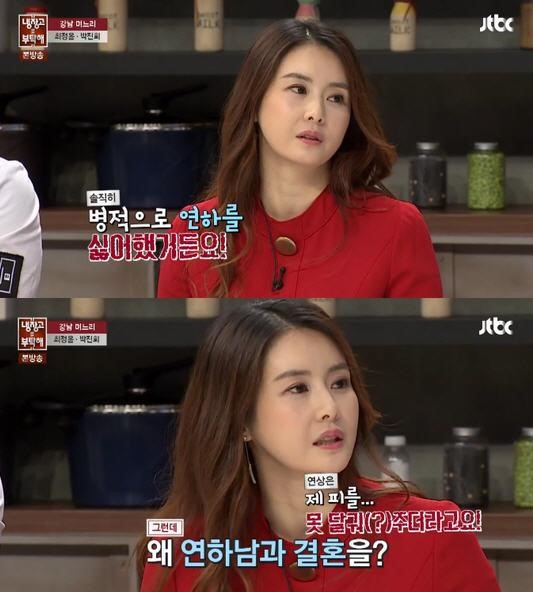연하와 결혼한 이유에 대해 최정윤은 “연상은 내 피를 못 달궈주더라. 열정이 받쳐주지 못한다”며 “뭘 같이 해도 피곤해하고 일주일에 두 번만 만나려고 하는 게 힘들더라”라고 답했다. 정형돈을 대신해 스페셜 MC를 맡은 허경환은 “이 누나 세다”고 답했다.