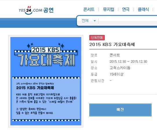 ‘2015 KBS 가요대축제’ 측은 “YES24를 통해 8일부터 진행한 티켓 예매가 오픈 한 지 35분 만에 매진됐다”고 밝혔다.