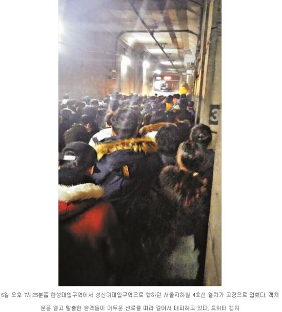 6일 퇴근이 한창이던 오후 7시25분쯤 한성대입구역에서 성신여대입구역으로 향하던 서울 지하철 4호선 열차가 고장으로 멈췄습니다. 그것도 터널 안이라 800여명의 승객들은 어두운 선로를 따라 30분 동안 걸어서 긴급 대피해야만 했습니다. 한성대입구역과 성신여대입구역으로 나눠 이동하는 과정에서 16명이 찰과상과 염좌 등 경상을 입어 인근 병원으로 옮겨졌습니다.