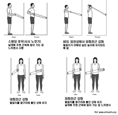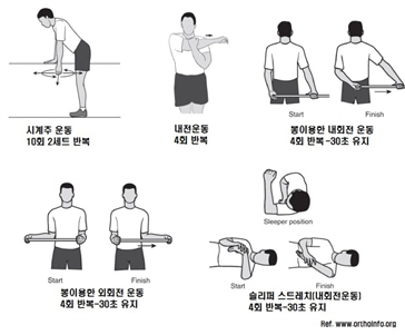 스트레칭으로 아픈 팔을 안으로 모아주는 내전 및 내회전운동과 밖으로 벌려주는 외회전운동을 한다. 기본적으로 8회 1세트로 해서 3세트 시행하며 근력이 좀 늘면 횟수를 늘려서 각12회 3세트까지 진행한다. 이때 반동을 이용하지 않고 천천히 동작하도록 한다.