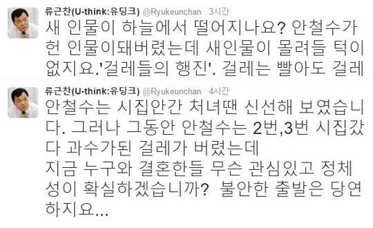 류근찬 전 국회의원은 11일 자신의 트위터에 안 의원을 “2~3번 시집 갔다 과수(寡守)된 걸레”라고 칭했습니다. 류 전 의원은 “안철수는 시집 안 간 처녀땐 신선해 보였다”면서 “그동안 안철수는 2~3번 시집 갔다 과수가 된 걸레가 돼버렸는데 지금 누구와 결혼한들 무슨 관심 있고 정체성이 확실하겠나? 불안한 출발은 당연하다”고 맹비판했습니다.