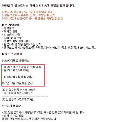 한 중고자동차 쇼핑몰에는 지난해 12월 23일에 “리스기간 총 36개월 중 33회 남음”이라고 밝힌 롤스로이스 매물(리스 승계)이 등록됐다.