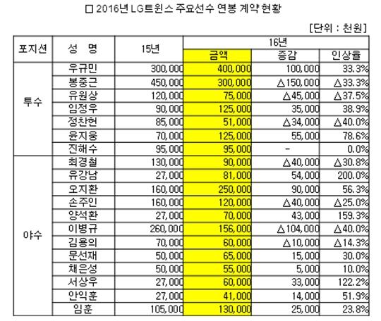 포수 유강남은 200% 오른 8100만원, 내야수 양석환은 159% 인상된 7000만원, 내야수 서상우는 122% 오른 6000만원에 계약했다. 반면 최경철(9000만원), 손주인(1억2000만원), 이병규(등번호 7·1억5600만원), 김용의(6000만원)은 연봉 삭감을 감수했다.