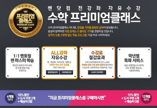 쎈닷컴은 수강료 할인과 함께 신사고 교재 무료 제공 등 최대 16만원 상당의 혜택을 제공한다. 수학 프리미엄클래스 6개월 구매 시 수강료 10%할인과 신사고 교재 2권, 12개월 구매 시 수강료 15%할인과 신사고 교재 4권을 증정한다. 예비 중학교 1학년부터 예비 고등학교 2학년까지 최대 2개 학년을 선택해 수강할 수 있으며 강좌에 대한 자세한 정보는 홈페이지(www.ssen.com)를 통해 확인 가능 하다.