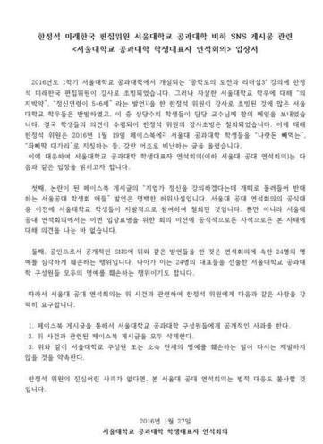 한 위원은 “자살한 서울대 학생과 관련된 글은 서울대 공대 학생회의 명예와 관계가 없다. 그러므로 페이스북의 관련 글들을 모두 삭제해 달라는 요구는 개인이 가진 표현의 자유를 심각하게 침해하는 것”이라며 “특히 본인이 진실이라 믿었던 기사에, 그것도 단정짓지 않은 내용을 단정화시켜서 공개적으로 본인을 파렴치한 자로 모는 것은 본인의 명예에도 심각한 피해를 주고 있다는 점을 서울대 공대 학생회가 인지하기를 부탁드린다”고 말했다.