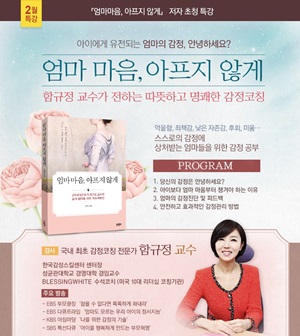 함 교수는 특강에서 ▲당신의 감정은 안녕하세요? ▲아이보다 엄마 마음부터 챙겨야 하는 이유 ▲엄마의 감정진단 및 피드백 ▲안전하고 효과적인 감정관리 방법 등을 주제로, 일상에서 엄마들을 괴롭히는 감정을 다독여 스스로의 감정을 충분히 느끼고 표현하는 방법을 코칭할 예정이다.