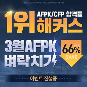 이에 AFPK/CFP 합격률 1위를 기록하고 있는 해커스 금융이 다음달 13일(일) 제61회 AFPK 시험을 앞두고 최대 66% 할인된 가격에 AFPK 인강을 수강할 수 있는 ‘3월 AFPK벼락치기 패키지’를 선보여 관심을 모으고 있다. 3월부터 본격적으로 시작되는 2016년 상반기 금융권 공채를 앞두고 AFPK 시험에 대한 관심이 고조된 가운데, 문의가 이어지고 있다.