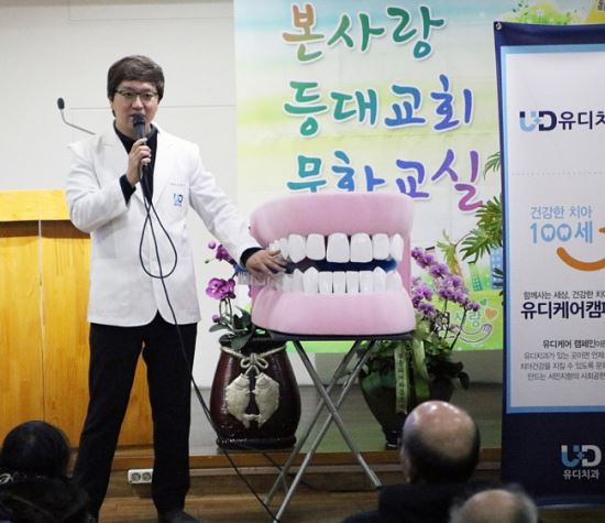 [쿠키뉴스=김단비 기자] 유디치과가 본사랑재단과 함께 서울시 동대문구에 위치한 한 교회에서 쪽방촌 주민 50여명을 초대, 구강건강교실을 열었다.