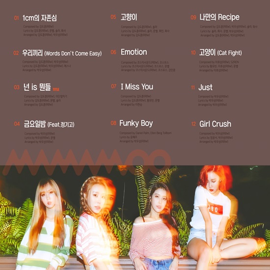 공개된 트랙리스트를 보면, 타이틀곡 '넌 is 뭔들'과 프리싱글 ‘1cm의 자존심’, ‘아이 미스 유(I Miss You)’를 비롯해 ‘우리끼리’, ‘금요일밤’, ‘고향이’, ‘이모션(Emotion), '펑키보이(Funky Boy)', '나만의 Recipe’, ‘고양이’, ‘저스트(Just)’, ‘걸 크러쉬(Girl Crush)' 등 총 12개의 곡들로 구성돼 있습니다.