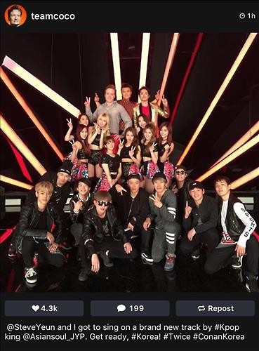 "[쿠키뉴스=김현섭 기자] 최근 방한했던 미국 유명 토크쇼 진행자 코난 오브라이언이 박진영의 신곡에 참여했다며 자신의 SNS에 뮤직비디오 ‘인증샷’을 공개했다.