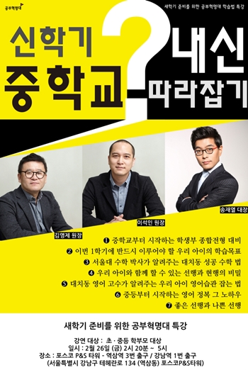 이번 강연회는 '중학교부터 준비하는 학생부 종합전형'이란 주제로, 공부혁명대 송재열 대장, 대치 페르마 김영제 원장, 송글리쉬 이석인 원장이 연사로 나서 강연한다.