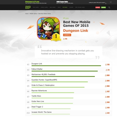 2P닷컴은 미국의 게임 전문 사이트로 최근 ‘온라인게임’, ‘웹게임’, ‘모바일게임’ 3개의 카테고리, 총 17개 부문에 걸쳐 ‘Best of 2015’를 선정했다. 게임빌의 ‘던전링크’는 ‘모바일게임’ 카테고리의 ‘Best New Mobile Game’ 부문에 오른 23종의 후보작 중 가장 많은 표를 받아 1위에 선정되었다.