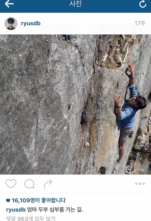 24일 SNS와 인터넷 커뮤니티는 류준열이 과거 자신의 인스타그램에 올린 사진 때문에 달아올랐다. 이 사진에는 “엄마 두부 심부름 가는 길”이라면서 류준열이 암벽 등반하는 듯한 사진이 담겨있다.