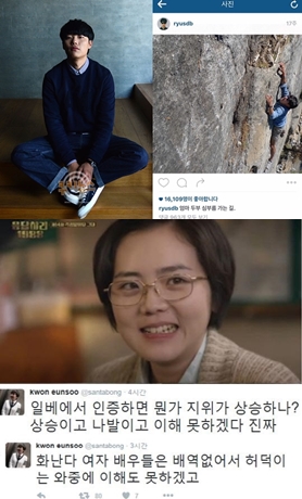 권은수는 24일 자신의 트위터에 “일베에서 인증하면 뭔가 지위가 상승하나? 상승이고 나발이고 이해 못하겠다. 진짜”라면서 “화난다. 여자 배우들은 배역 없어서 허덕이는 와중에 이해도 못하겠고”라고 적었다. “필리버스터와 일베 인증이 동시간에 일어나다니 내가 사는 곳 너무 대단하다”라고도 했다.