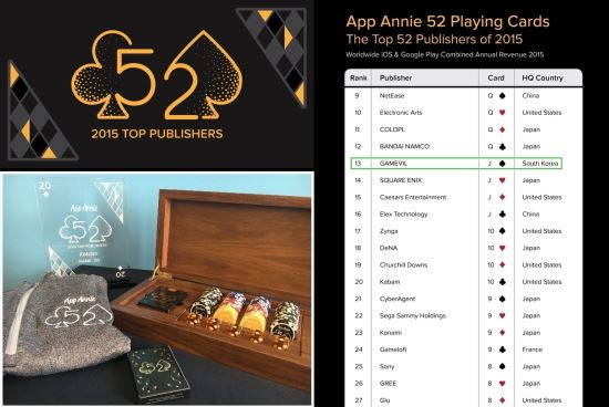 이번 ‘52 The Top Publishers of 2015’에서 게임빌은 13위에 이름을 올렸다. 양사는 ‘드래곤 블레이즈’, '서머너즈 워: 천공의 아레나', ‘크로매틱소울’, ‘원더택틱스’ 등으로 세계시장에 역량을 쏟고 있다. daniel@kukimedia.co.kr
